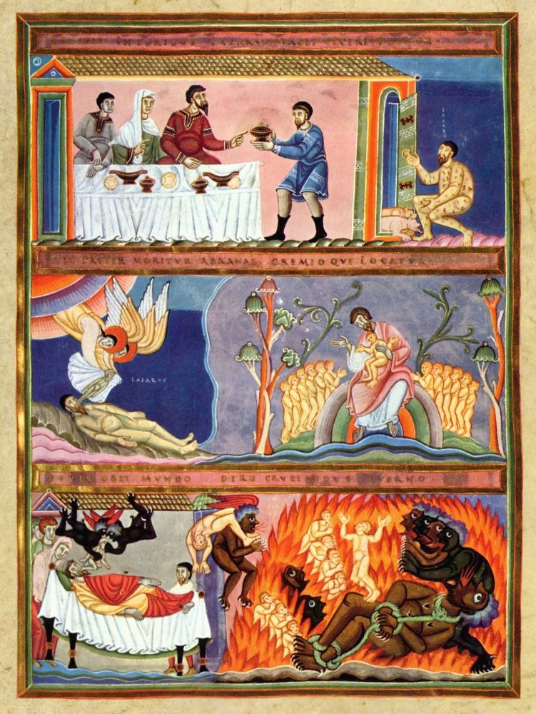 Drugi świat to leżący przed pałacem bogacza żebrak. Nieustannie głodny, pokryty wrzodami, zaprzyjaźniony z psami, które tak jak on liczyły na resztki ze stołu uczty bogacza. One miały choć „miłosierdzie”, bo przynosiły ulgę żebrakowi liżąc jego wrzody i rany. Bogacz nie miał serca. Psy tak. Po śmierci żebrak cieszył się wiecznością. Ucztował w niebie. Codziennie. Nie musiał mieć psów jako towarzyszy, ale otaczały go anioły. Niedola sprzed bram ziemskiego pałacu na zawsze się skończyła. Nie patrzył już na swoje wrzody, lecz na ojca Abrahama.